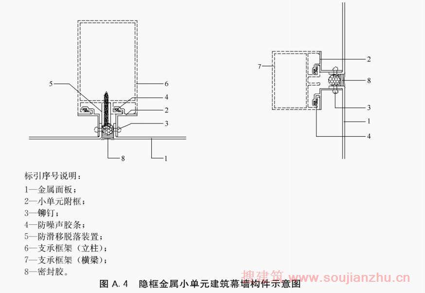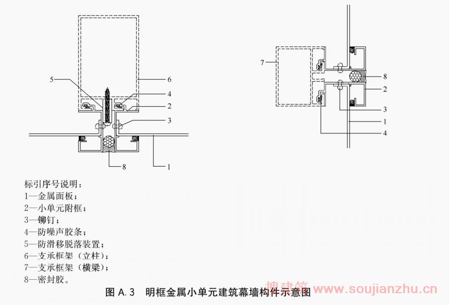金属小单元建筑幕墙构件按构造形式分为明框(图A.3)、隐框(图A.4)和半隐框(图A.3和图A.4组合使用)。