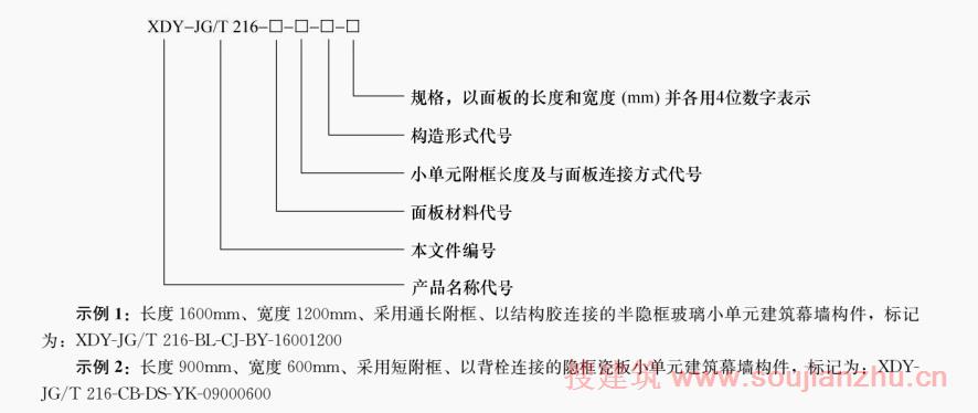 小单元建筑幕墙构件的产品名称代号为XDY,其标记由产品名称、本文件编号、面板材料、小单元附框长度及与面板连接方式、构造形式、规格组成。