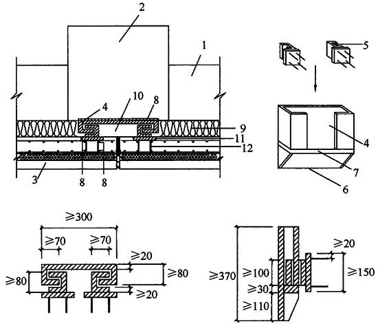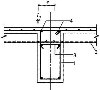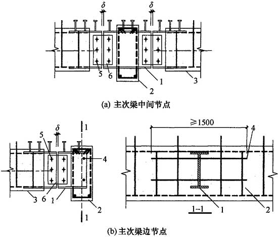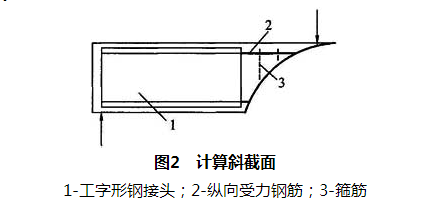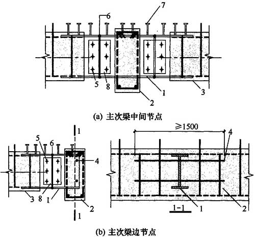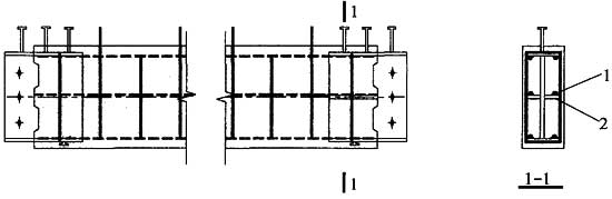 2.1.2 本规程推荐用混合梁中间段为钢筋混凝土梁,两端设有一定长度的工字形钢接头,梁纵向受力钢筋与工字形钢接头有效焊接,设计者可根据结构受力、跨度以及施工条件改变混合梁中间段的构造,框架梁也可采用型钢混凝土梁。