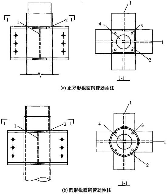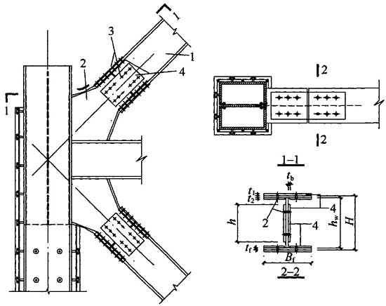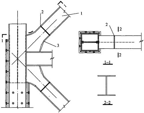 钢管及其管内混凝土共同承受外荷载作用,钢管外包混凝土仅起防腐、防火作用,钢管内设竖向加劲板并与柱外壁工字形钢接头腹板连为一体的柱。