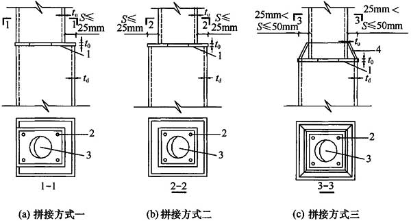 2.1.4 竖向加劲板延柱轴线方向设置,并与劲性柱钢管壁有效焊接。此种加劲板可方便钢管内混凝土的浇筑并保证其纵向不中断。可根据节点位置设置为“十”字形加劲板、“T”形加劲板、“一”字形加劲板,与梁连接部位的竖向加劲板宜贯通设置,伸出柱壁一定长度,作为劲性柱与混合梁连接的工字形钢接头的腹板。劲性柱与混合梁不连接时也可不设置竖向加劲板。
