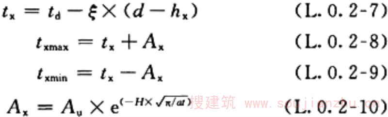 5 上限以下任意深度(自地面起算)h x 处地温的年平均值t x 、最高值t xmax 、最低值t xmin ,可按下列公式计算: