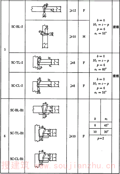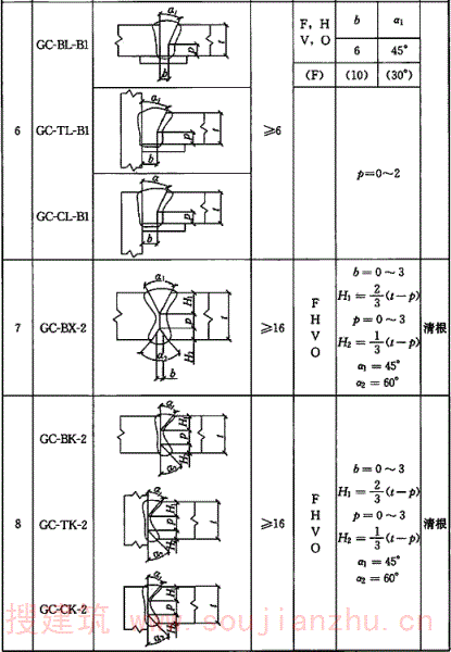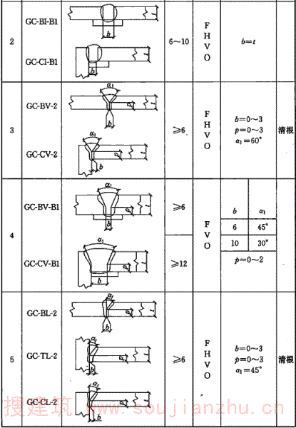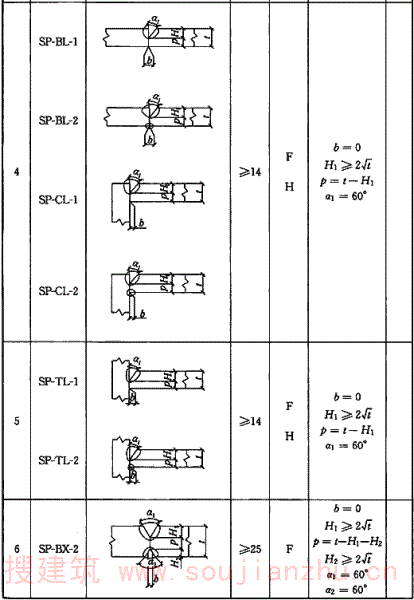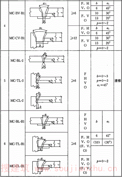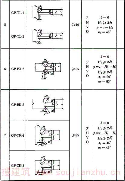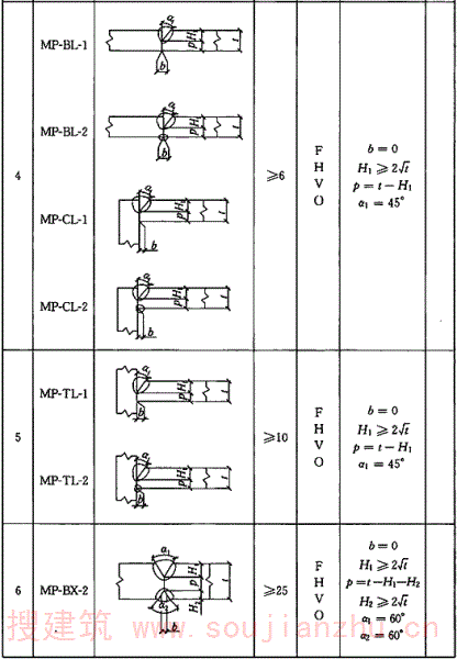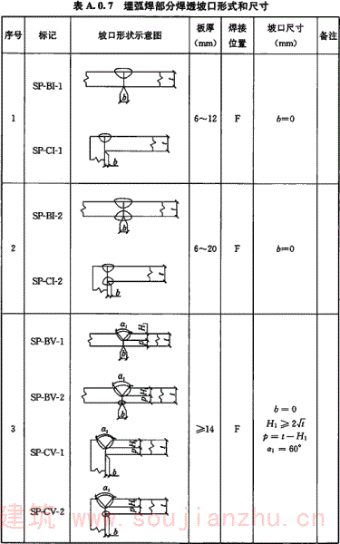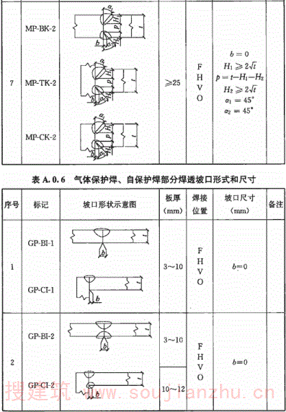 A.0.6 气体保护焊、自保护焊部分焊透坡口形式和尺寸宜符合表A.0.6的要求。