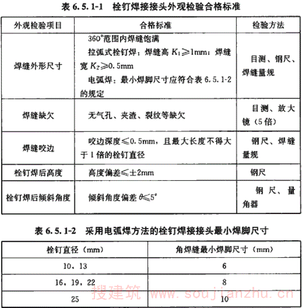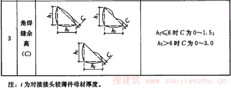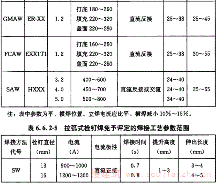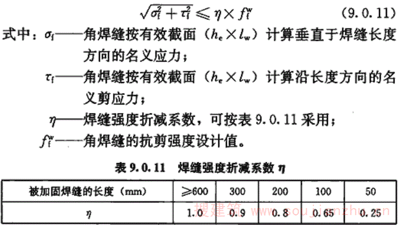 9.0.11 焊缝缺陷的修补方法是根据国内实践经验提出的。采用加大焊缝厚度和加长焊缝长度两种方法来加固角焊缝都是行之有效的。国外资料介绍加长角焊缝长度时,对原有焊缝中的应力限值是不超过焊缝的计算强度。但加大角焊缝厚度时,由于焊接时的热影响会使部分焊缝暂时退出工作,从而降低了原有角焊缝的承载能力。所以对在负荷状态下加大角焊缝厚度时,必须对原有角焊缝中的应力加以限制。 我国有关单位的试验资料指出,焊缝加厚时,原有焊缝中的应力应限制在0.8fwf以内。据原苏联20世纪60年代通过试验得出的结论是:加厚焊缝时,焊接接头的最大强度损失一般为10%~20%。 根据近年来国内的试验研究,在负荷状态下加厚焊缝时,由于施焊时的热作用,在温度T≥600℃区域内的焊缝将退出工作,致使焊缝的平均强度降低。经计算分析并简化后引入了原焊缝在加固时的强度降低系数η,详见现行中国工程建设标准化协会标准《钢结构加固技术规范》CECS 77的相关规定。本规范引用了这条规定。