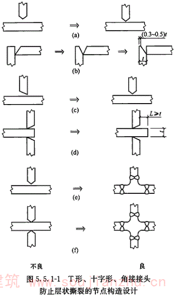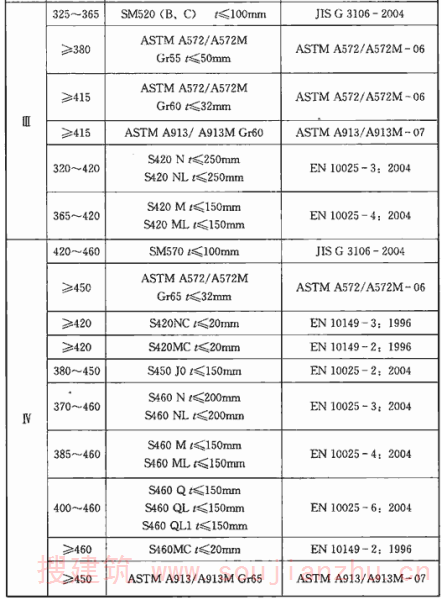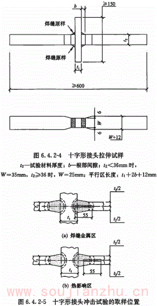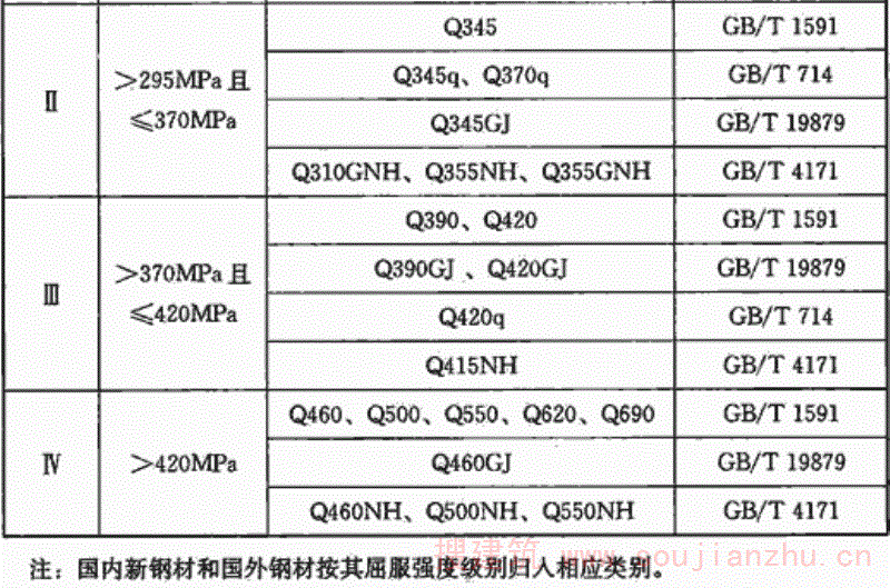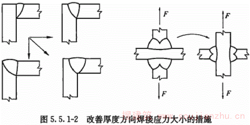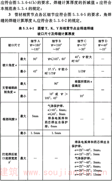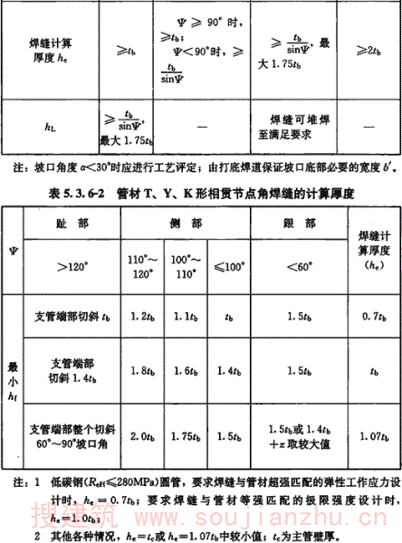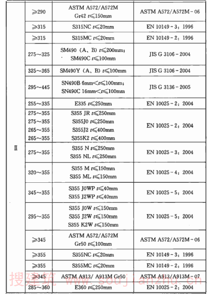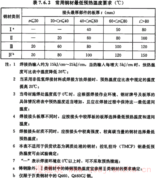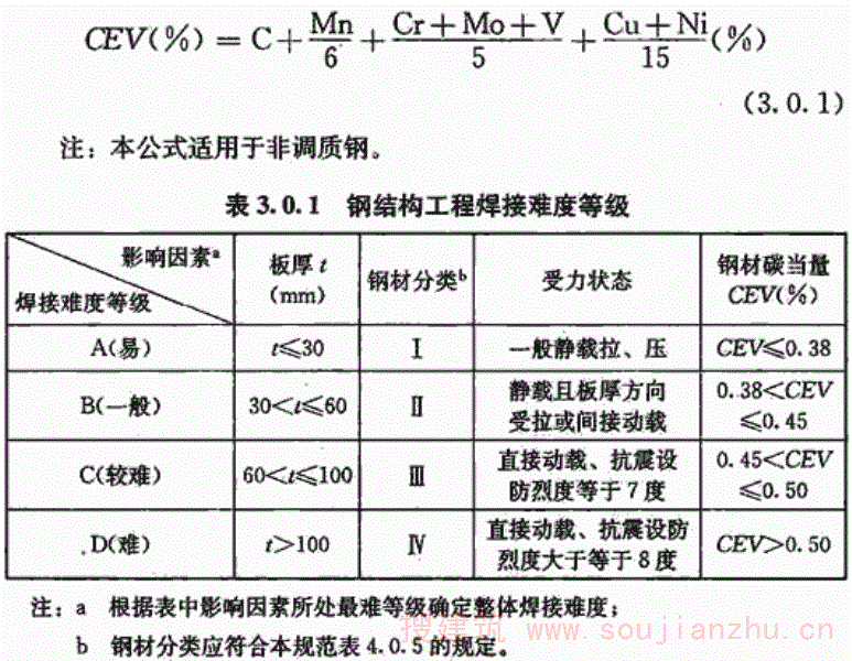 但目前国内大部分现行钢材标准主要还是以国际焊接学会IIW的碳当量CEV作为评价其焊接性优劣的指标,为了与钢材标准规定相一致,本规范仍然沿用国际焊接学会IIW的碳当量CEV公式,对于含碳量小于0.18%的情况,可通过试验或采用Pcm评价钢材焊接性。 板厚的区分,是按照目前国内钢结构的中厚板使用情况,将t≤30mm定为易焊的结构,将t=30mm~60mm定为焊接难度一般的结构,将t=60mm~100mm定为较难焊接的结构,t>100mm定为难焊的结构。 受力状态的区分参照了有关设计规程。