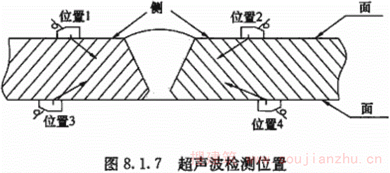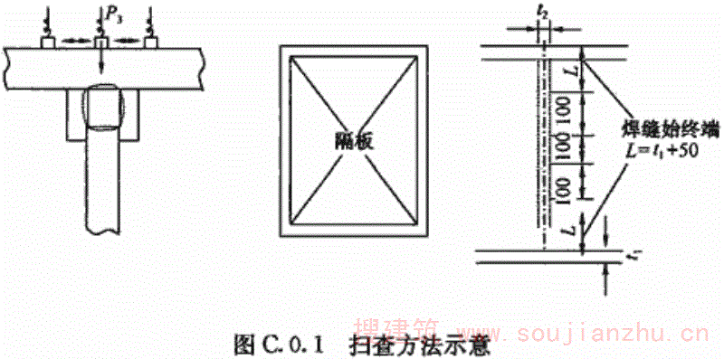 C.0.1 应采用超声波垂直探伤法以使用的最大声程作为探测范围调整时间轴,在被探工件无缺陷的部位将钢板的第一次底面反射回波调至满幅的80%高度作为探测灵敏度基准,垂直于焊缝方向从焊缝的终端开始以100mm间隔进行扫查,并应对两端各50mm+t 1 范围进行全面扫查(图C.0.1)。