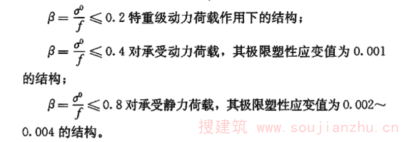 9.0.7 在负荷状态下进行加固补强时,除必要的施工荷载和难于移动的固定设备或装置外,其他活动荷载都必须卸除。用圆钢、小角钢制成的轻钢结构因杆件截面较小,焊接加固时易使原有构件因焊接加热而丧失承载能力,所以不宜在负荷状态下采用焊接加固。特别是圆钢拉杆,更严禁在负荷状态下焊接加固。对原有结构构件中的应力限制主要参考原苏联的有关经验和国内的几个工程试验,同时还吸收了国内的钢结构加固工程经验。原苏联于1987年在《改建企业钢结构加固计算建议》中认为所有构件(不论承受静力荷载或是动力荷载)都可按内力重分布原则进行计算,仅对加固时原有构件的名义应力σ°(即不考虑次应力和残余应力,按弹性阶段计算的应力)与钢材强度设计值f的比值β限制如下:
