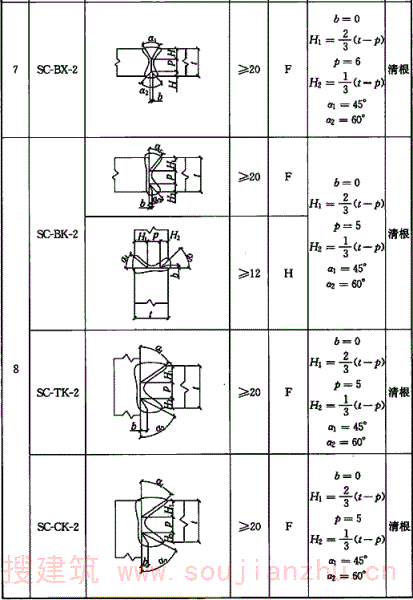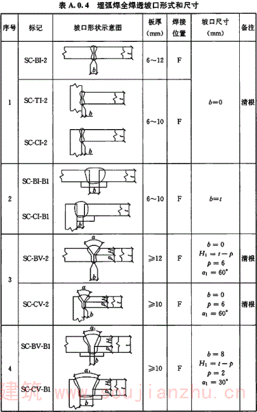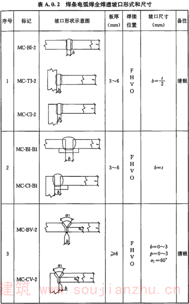 A.0.2 焊条电弧焊全焊透坡口形式和尺寸宜符合表A.0.2的要求。