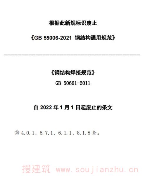 现批准《钢结构焊接规范》为国家标准,编号为GB 50661-2011,自2012年8月1日起实施。其中,第4.0.1、5.7.1、6.1.1、8.1.8条为强制性条文,必须严格执行。