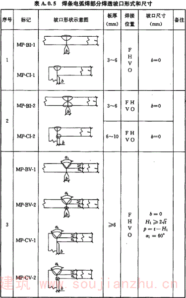 A.0.5 焊条电弧焊部分焊透坡口形式和尺寸宜符合表A.0.5的要求。