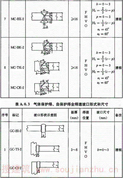 A.0.3 气体保护焊、自保护焊全焊透坡口形式和尺寸宜符合表A.0.3的要求。