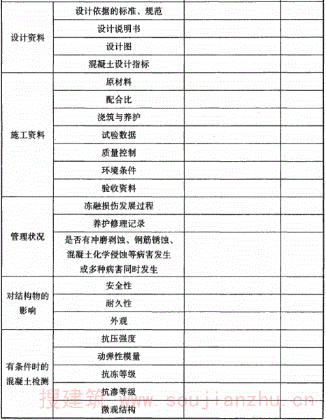 3.0.4本条给出了建议的混凝土结构耐久性调查、检测内容,可根据工程的具体情况选择相应的调查和检测内容,条文未包括全部检测内容,如有时需检测混凝土表层渗透性、氯离子扩散系数、混凝土孔结构等,应根据工程实际情况确定混凝土结构耐久性调查、检测内容。 混凝土结构耐久性评定有关内容可参考国家现行标准《混凝土结构耐久性评定标准》CECS220执行。