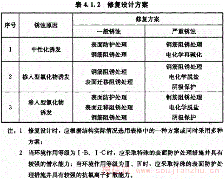 3.0.5 修复与防护设计应根据不同结构类型及其环境作用等级、耐久性损伤原因及类型、预期修复效果、目标使用年限等,制定相应的修复与防护设计方案,并应包括下列内容: