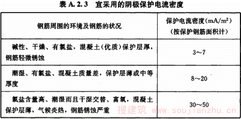 A.2.3 电化学保护电流密度除应使保护效果达到本规程第A.3.5条的规定外,尚应控制在不降低阳极系统和混凝土质量的范围内。具体保护电流密度宜通过经验数据或进行现场试验确定,也可按照表A.2.2选取,不同条件混凝土结构阴极保护电流密度也可按表A.2.3选取。