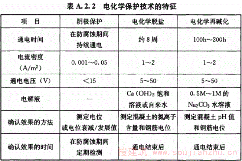 A.2.1为了保证电化学保护技术能有效发挥作用,应在实施电化学保护之前对被保护的钢筋混凝土结构进行必要的检查和修整,保证钢筋与阳极系统之间既存在良好的离子通路,又不会造成短路。 如果被保护的钢筋混凝土存在因钢筋锈蚀胀裂、剥落或其他原因导致混凝土分层破损,均需凿除这些破损的混凝土保护层,清除钢筋上的锈层。然后对保护区域内混凝土上凿除部位或其他分层部位用水泥基修补材料修复至原断面,必要时应进行加固处理。 在保护范围内,所有需保护的钢筋均应具有良好的电连续性,否则没有电连接的钢筋会发生杂散电流腐蚀;阴极系统和阳极系统之间的短路会使阴极保护系统失效。所以,在实施电化学保护之前,应对钢筋的电连接性和阴极与阳极之间的短路现象进行必要的检测和评定。