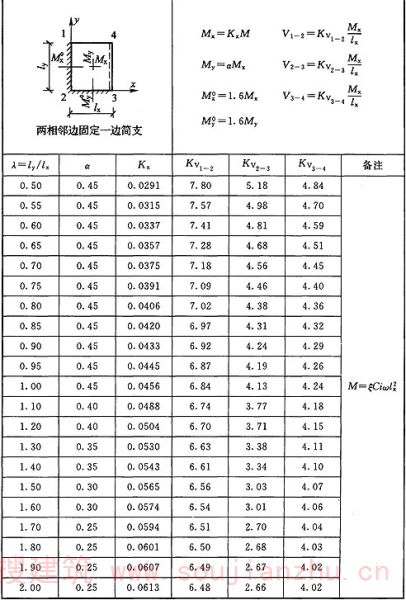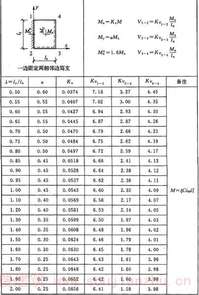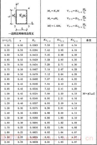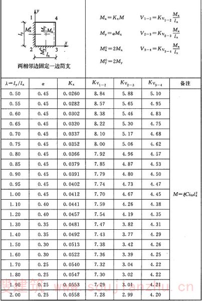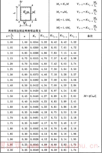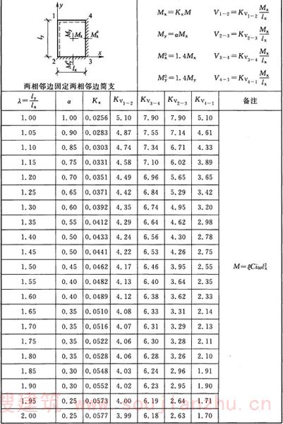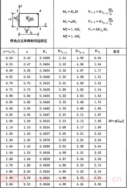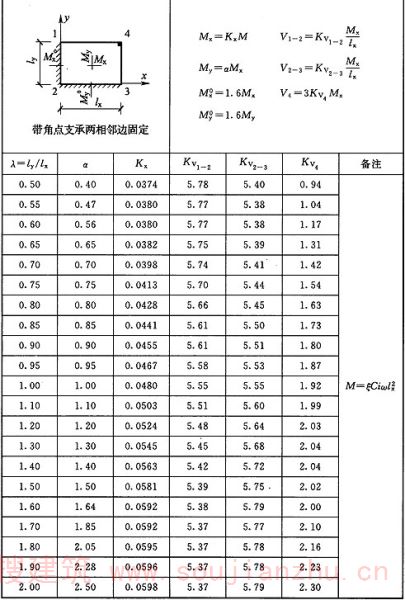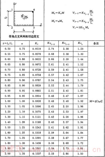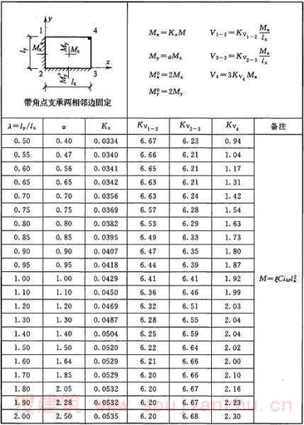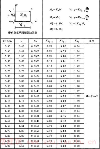 表E.0.3 带角点支承的两相邻边支承板的弯矩系数和动反力系数