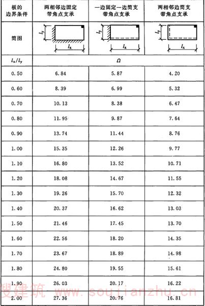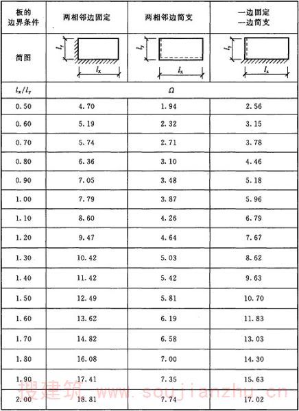 C.0.3 两相邻边支承及带角点支承的薄板自振圆频率系数Ω,可按表C.0.3查取。