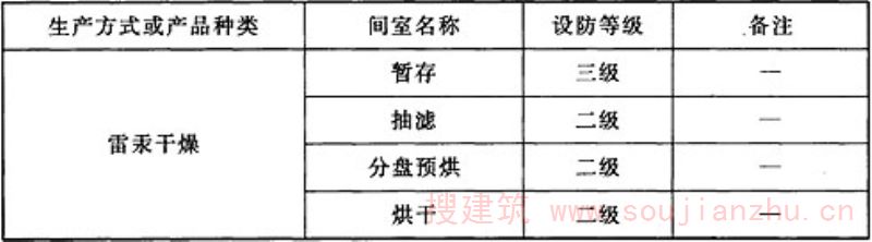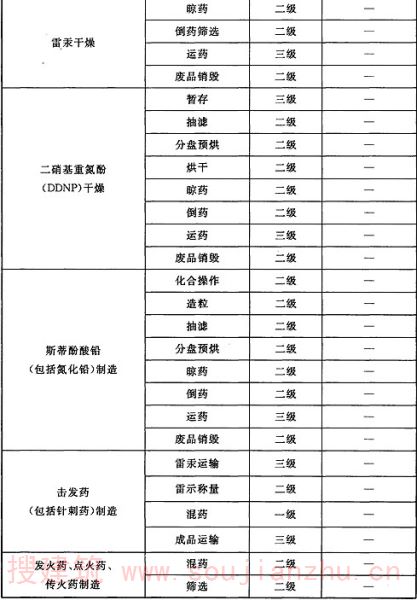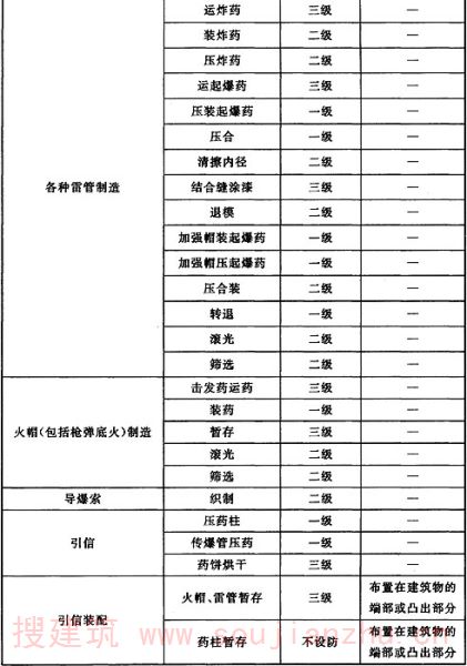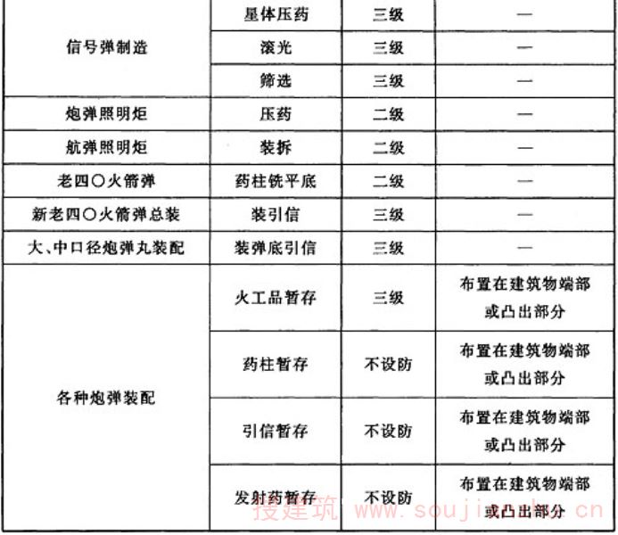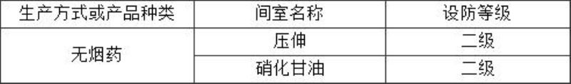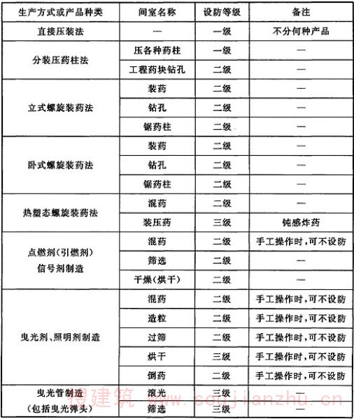 注:1 分装压药柱法压药柱,生产自动化程度较高时,采用自动控制容积称量,可降低设防等级;