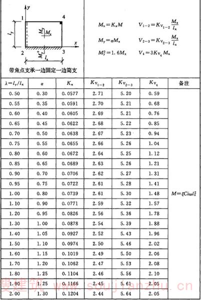 E.0.3 带角点支承的两相邻边支承板的弯矩系数和动反力系数,可按表E.0.3查取。
