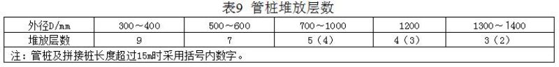 9.1.3 管桩应按规格、类型、型号、壁厚、长度分别堆放,堆放过程中应采用可靠的防滑、防滚等安全措施。堆放层数不宜超过表9的规定。