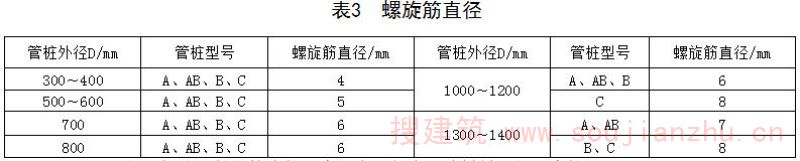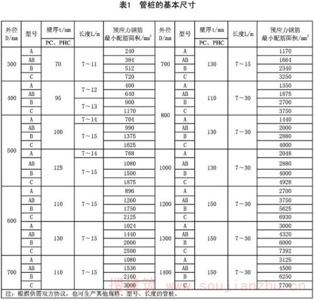 3.2.1 管桩按外径分为300mm、(350mm)、400mm、(450mm)、500mm、(550mm)、600mm、700mm、800mm、1000mm、1200mm、1300mm、1400mm等规格。