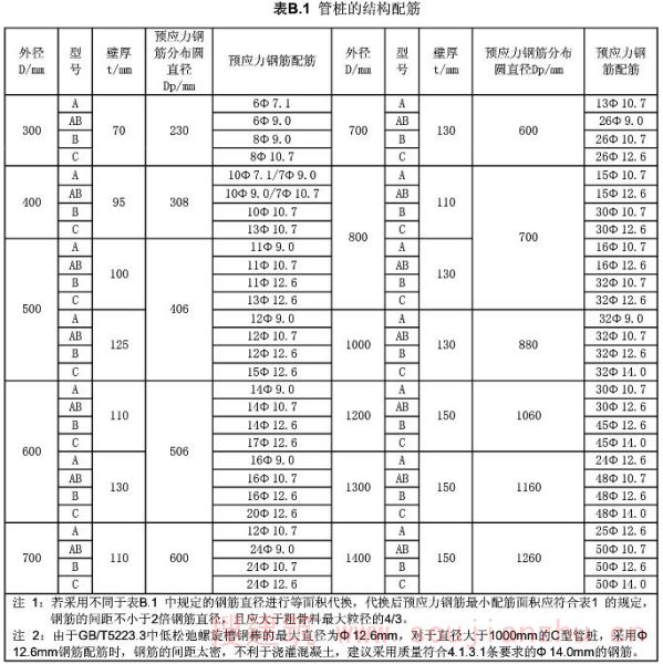 与表1中预应力钢筋最小配筋面积对应的管桩结构配筋见表B.1。