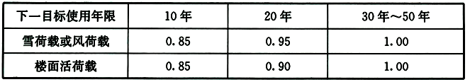 A.0.8 对加固改造设计的验算,其基本雪压值、基本风压值和楼面活荷载的标准值,除应按现行国家标准《建筑结构荷载规范》GB 50009的规定采用外,尚应按下一目标使用年限,乘以表A.0.8的修正系数ψ a 予以修正。下一目标使用年限,应由委托方和鉴定方共同商定。