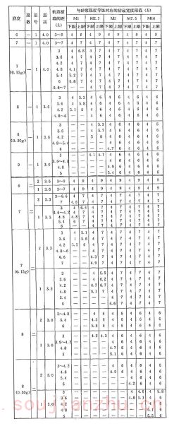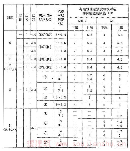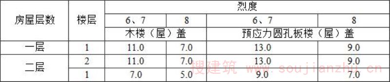 1 表中的抗震横墙间距,对横墙间距不同的木楼(屋)盖房屋为最大横墙间距值。表中分别给出房屋宽度的下限值和上限值,对确定的抗震横墙阎距,房屋宽度应在下限值和上限值之间选取确定;抗震横墙间距取其他值时,可内插求得对应的房屋宽度限值。