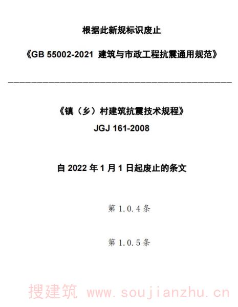 1.0.4 抗震设防烈度为6度及以上地区的村镇建筑,必须采取抗震措施。 ( 自2022年1月1日起废止该条,详见新规 《建筑与市政工程抗震通用规范》GB 55002-2021)