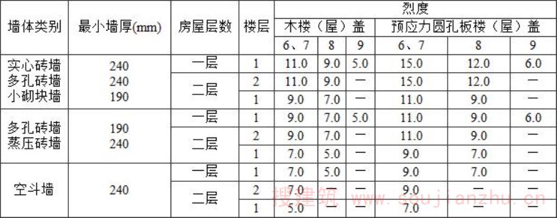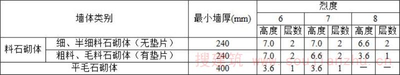 注:表中墙体类别指:①240mm厚细、半细料石砌体;②240mm厚粗料、毛料石砌体;③400mm厚平毛石墙。