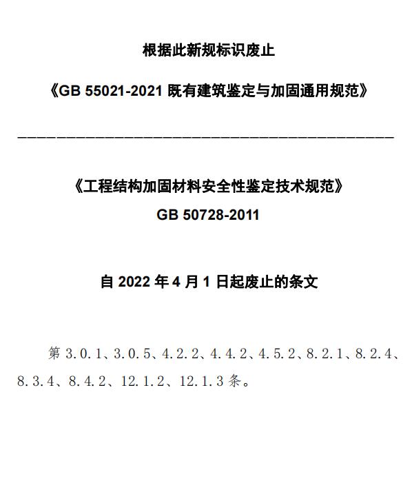 现批准《工程结构加固材料安全性鉴定技术规范》为国家标准,编号为GB 50728-2011,自2012年5月1日起实施。其中,第3.0.1、3.0.5、4.1.4、4.2.2、4.4.2、4.5.2、5.2.5、6.1.4、7.1.5、8.2.1、8.2.4、8.3.4、8.4.2、9.1.2、9.3.1、12.1.2、12.1.3条为强制性条文,必须严格执行。