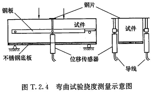 T.4.2 在试验机中安装带垫板的梁式试件及加荷装置。然后以(0.5±0.1)mm/min的加荷速率施加荷载,直至挠度达到0.20mm。此时,若试件已开裂,即可卸载,并取掉不锈钢垫板。若试件开裂不在三分点内,则该试件的试验结果无效。