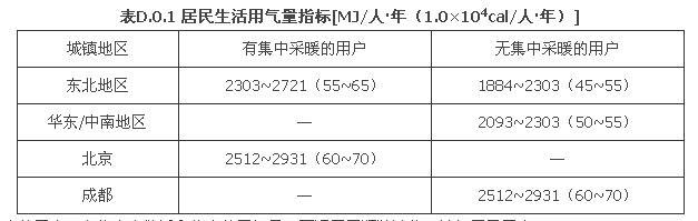 注:1 本表系指一户装有一个燃气表的用户,在住宅内做饭和热水的用气量。不适用于瓶装液化石油气居民用户。