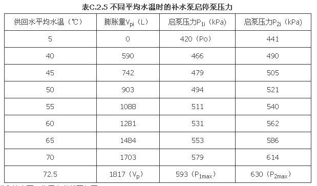 3 根据公式(C.2.5-1)、公式(C.2.5-2)和公式(6.9.6-2),计算出不同水温时水的膨胀量和水泵的启停压力如表C.2.5。