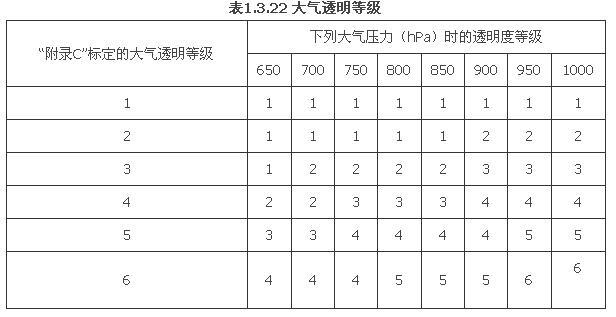 1.3.22 采用《采暖通风与空气调节设计规范》GB50019的“附录A”和“附录B”时,当地的大气透明度等级,应根据《采暖通风与空气调节设计规范》GB50019的“附录C”和夏季大气压力按表1.3.22确定。