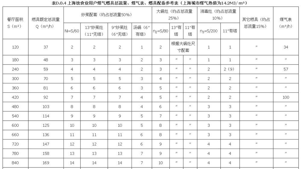 当餐厅面积大于表内所示时,仍可按燃具配备计算方式进行配置。