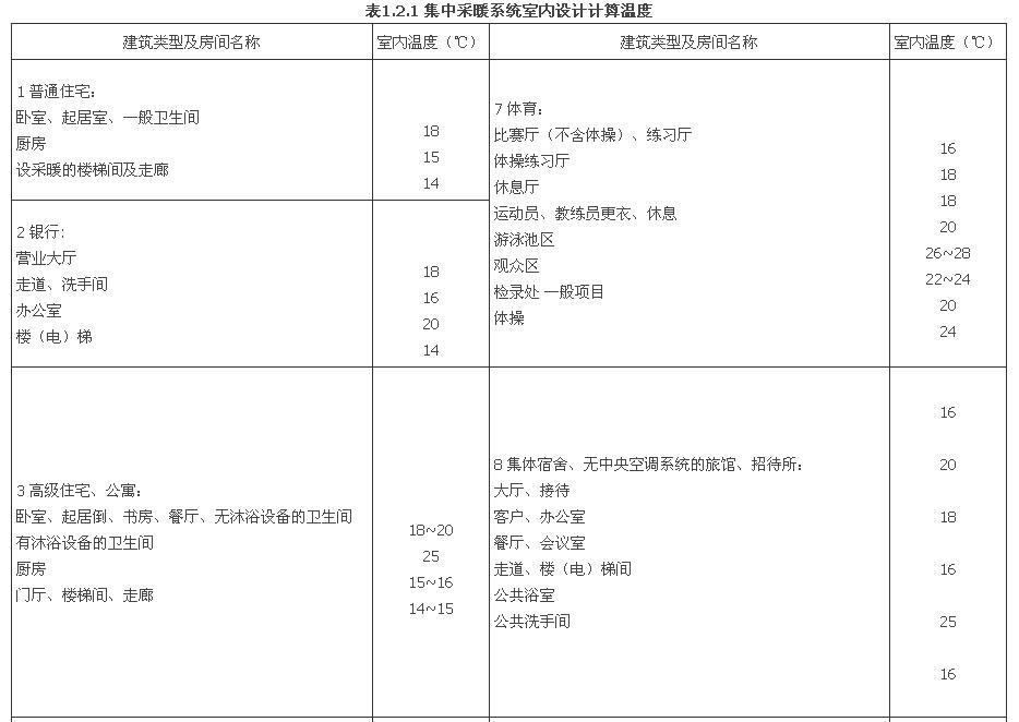 1.2.1 只设采暖系统的民用建筑的室内计算温度宜按表1.2.1确定。