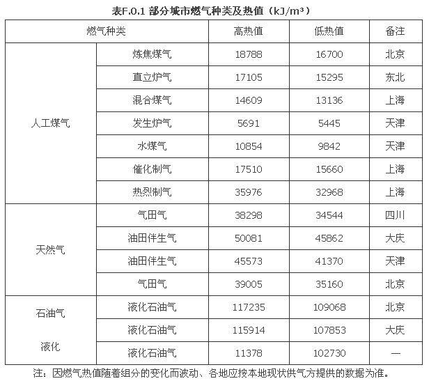 附录F 城市燃气种类及参考热值