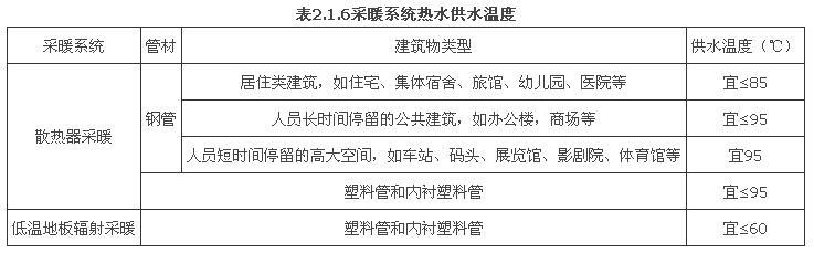 2.1.6 民用建筑采暖系统的热媒宜采用热水,热水的供水温度应根据建筑物性质、采暖方式、热媒性质及管材等因素确定,可参照表2.1.6的水温。