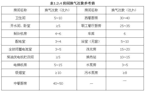 1.2.4 在设有空调的大型公共建筑物中,有放散热、湿、油烟、气味等的一些房间,一般情况下应通过热平衡计算,确定其通风换气量。当方案设计与初步设计缺乏计算通风量的资料或有其他困难时,可参考表1.2.4所列换气次数估算。