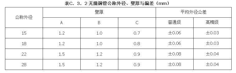 C.3.2 无缝铜管的公称外径、壁厚与偏差,应符合表C.3.2的规定。