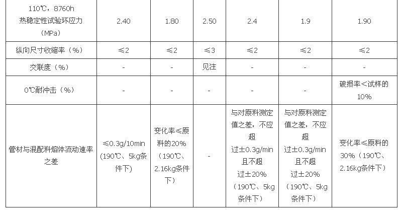 注:过氧化物交联(PE-Xa)交联度大于或等于70%;硅烷交联(PE-Xb)交联度大于或等于65%;辐照交联(PE-Xc)交联度大于或等于60%。