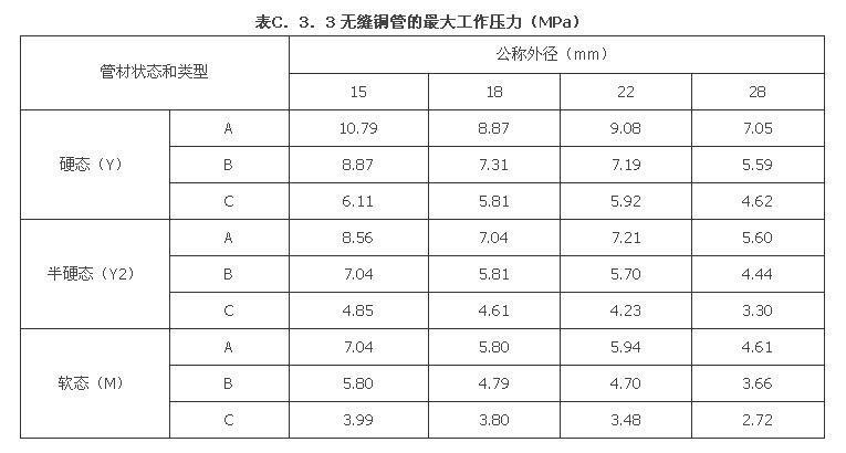 C.3.1 无缝铜管状态和类型的选择应满足系统工作压力。管径小于22mm时,宜选用软态铜管;管径为22mm或28mm时,应选用半硬态铜管。