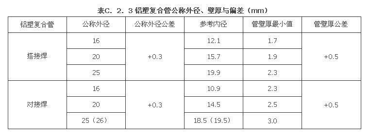 C.2.3 表中数据引自现行国家标准《铝塑复合压力管》GB/T 18997。
