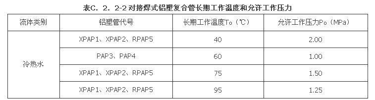 2 对接焊式铝塑复合管长期工作温度和允许工作压力应符合表C.2.2-2的规定。