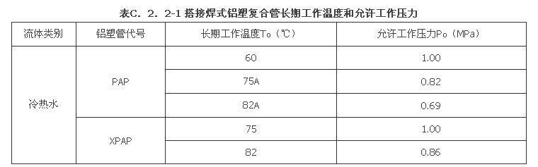 C.2.2 铝塑复合管长期工作温度和允许工作压力应符合下列规定: