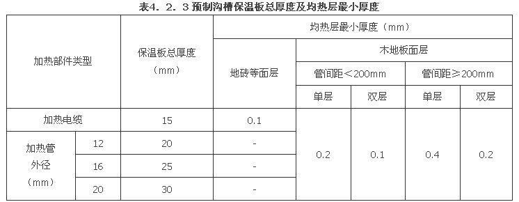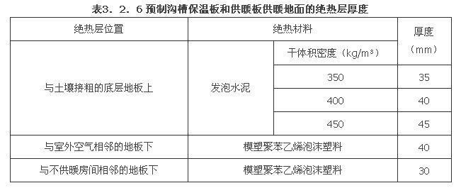 2.0.8 预制沟槽保温板分为不带金属均热层和带金属均热层两种,前者用于地砖、石材面层的热水地面供暖系统,后者保温板上铺设有与加热部件外径尺寸相同沟槽的金属均热层,用于需均热的木地板面层供暖地面,或用于加热电缆供暖地面,使加热电缆与绝热层不直接接触。保温板厚度一般不超过35mm。