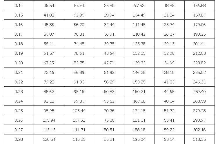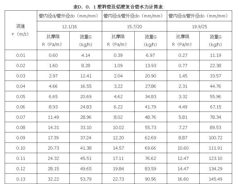 D.0.1 塑料管及铝塑复合管单位长度摩擦压力损失(比摩阻)可按表D.0.1计算。