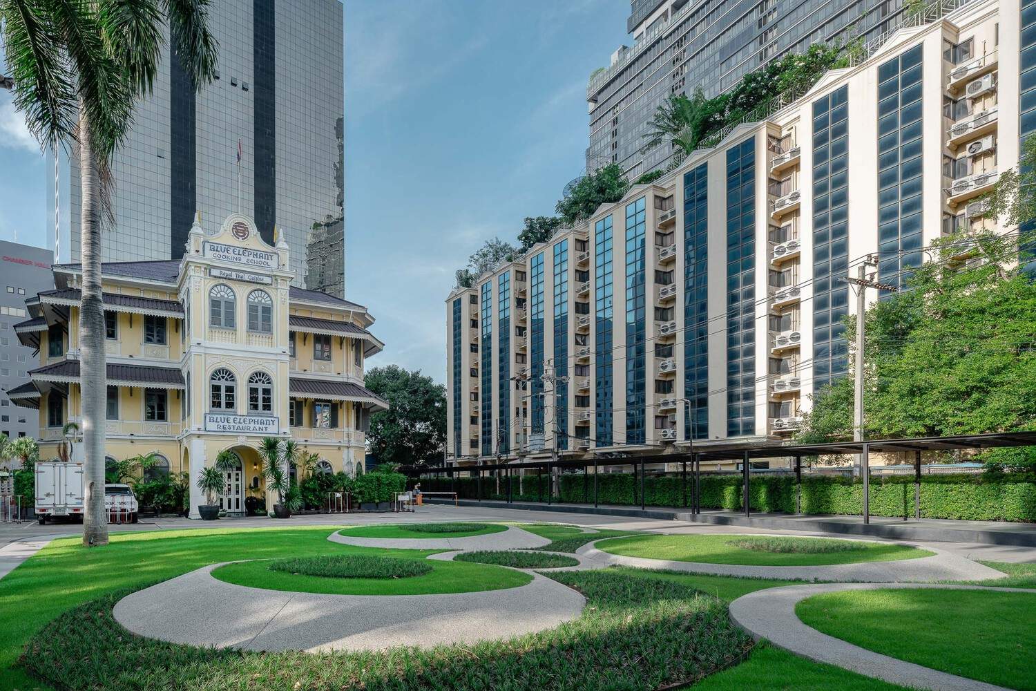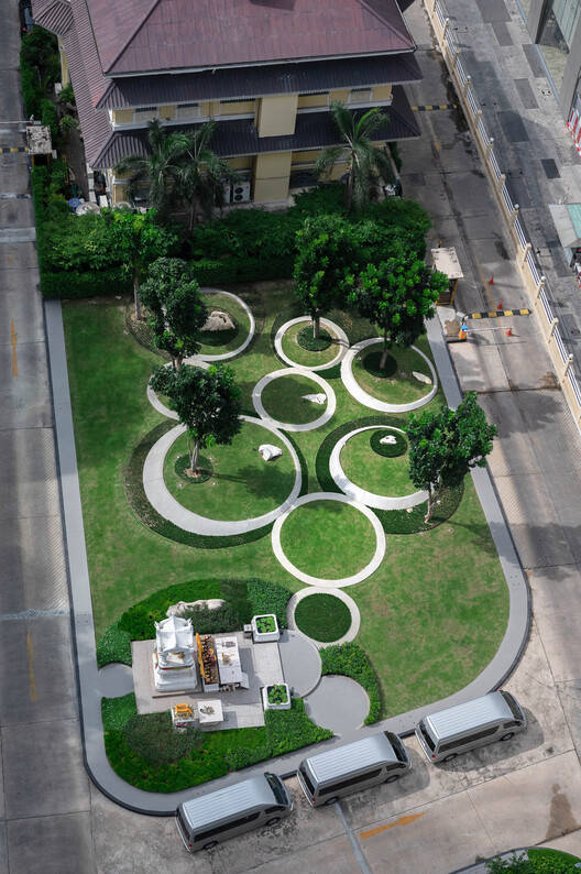 位于曼谷中央商务区的泰式中国拱门塔(泰国 CC 塔)俯瞰着一片绿地,蓝象烹饪学校兼餐厅、一座历史建筑,与车辆通道一起将此绿地一分为二。通过研究周围环境和可用空间可发现,该场地和中国古代“四合院”公共建筑有一定的相似之处。传统的四合院有一个中央庭院,两边都是房屋。该场地则两侧是高耸的建筑物,同时被四边的 Surasak 轻轨站包围。