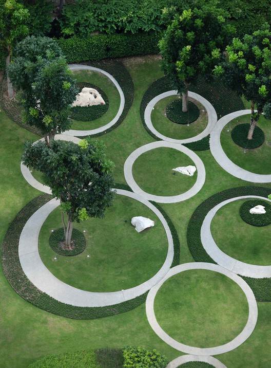 风水哲学的创新性景观诠释:项目在空间规划中融入了对风水思想的尊重,尤其在“水”的意象表达上展现了高度的创造力。鉴于现实场地对真实水景的限制,设计团队以象征性的手法——即由修剪灌木、雕塑树木和混凝土路缘构成的“雨滴”圆形波纹——来替代“水”的功能,实现了对流动、滋养和平衡的哲学表达。这种以硬景和软景和谐构成的景观序列,宛如一幅可步入的“中国山水画”,实现了文化内核与现代景观手法的完美嫁接。